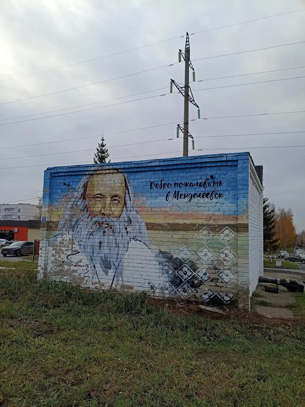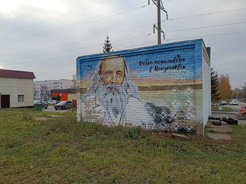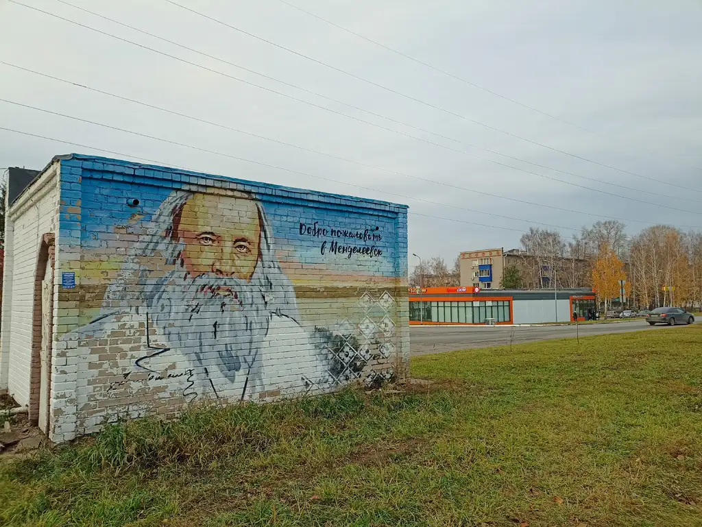 На мурале изображен портрет Д. И. Менделеева, в честь которого в 1967 году был назван город.