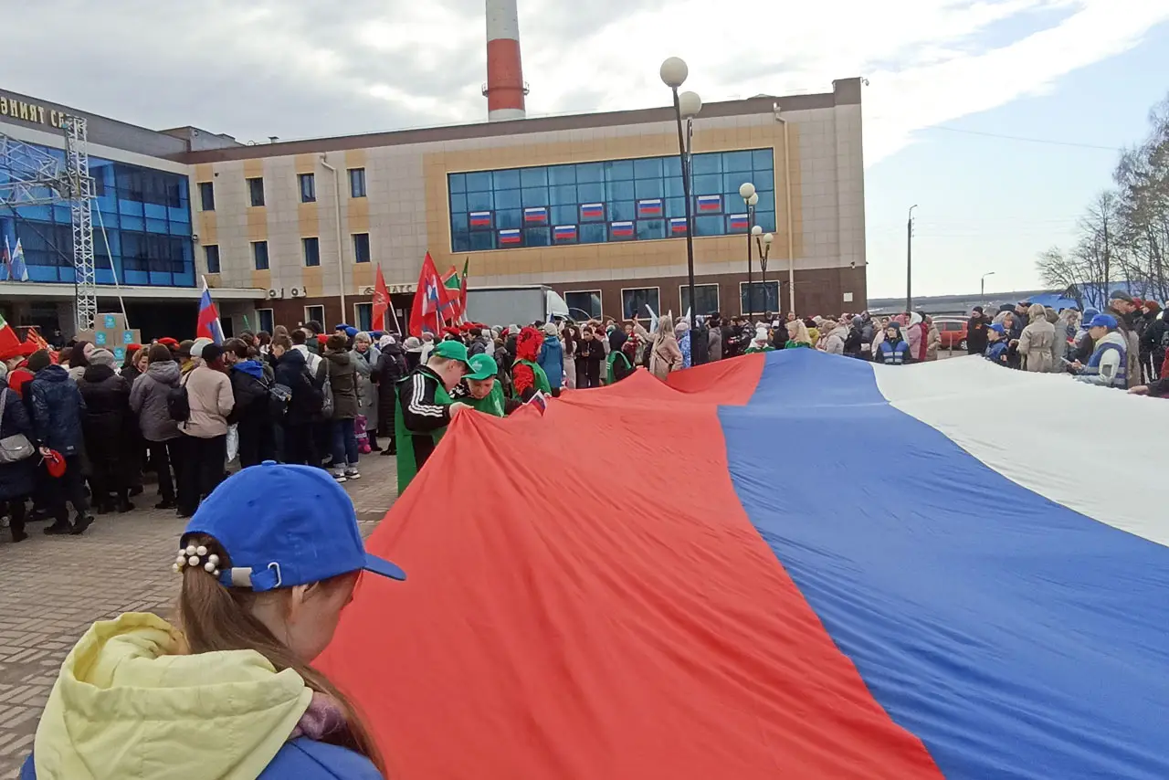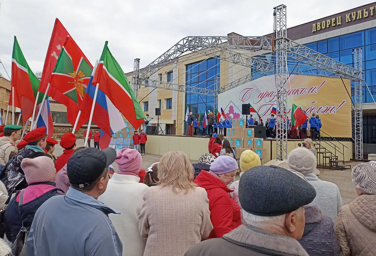 Песни о Родине, мире, Победе звучали со сцены в исполнении местных исполнителей, развивались флаги России, Татарстана, знамя Победы. Прямо перед сценой был растянут огромный Российский триколор.
