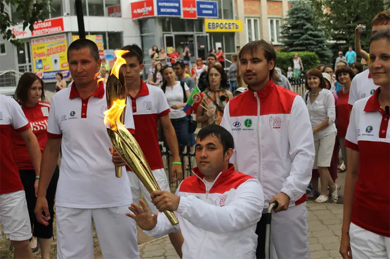Основная масса жителей собралась на Аллее Героев и на площади у РДК "Юность", где был организована финишная прямая. На завершающем этапе эстафеты, огонь Универсиады принял от спортсмена-колясочника глава Менделеевского муниципального района и города Менделеевска, Игорь Привалов.