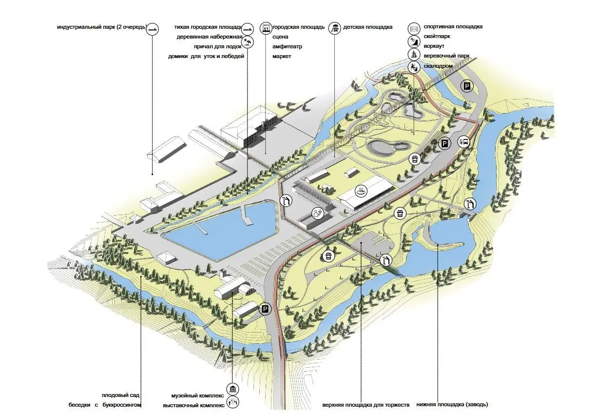 Были и довольно экстравагантные и не совсем продуманные предложения: веревочные мосты через Тойму, армейская полоса препятствия, отдельный ледовый каток и другие. У нескольких команд прозвучало предложение о создании объездной дороги вокруг парка (вдоль музея, через РМЦ с выходом ко второму мосту через Тойму).