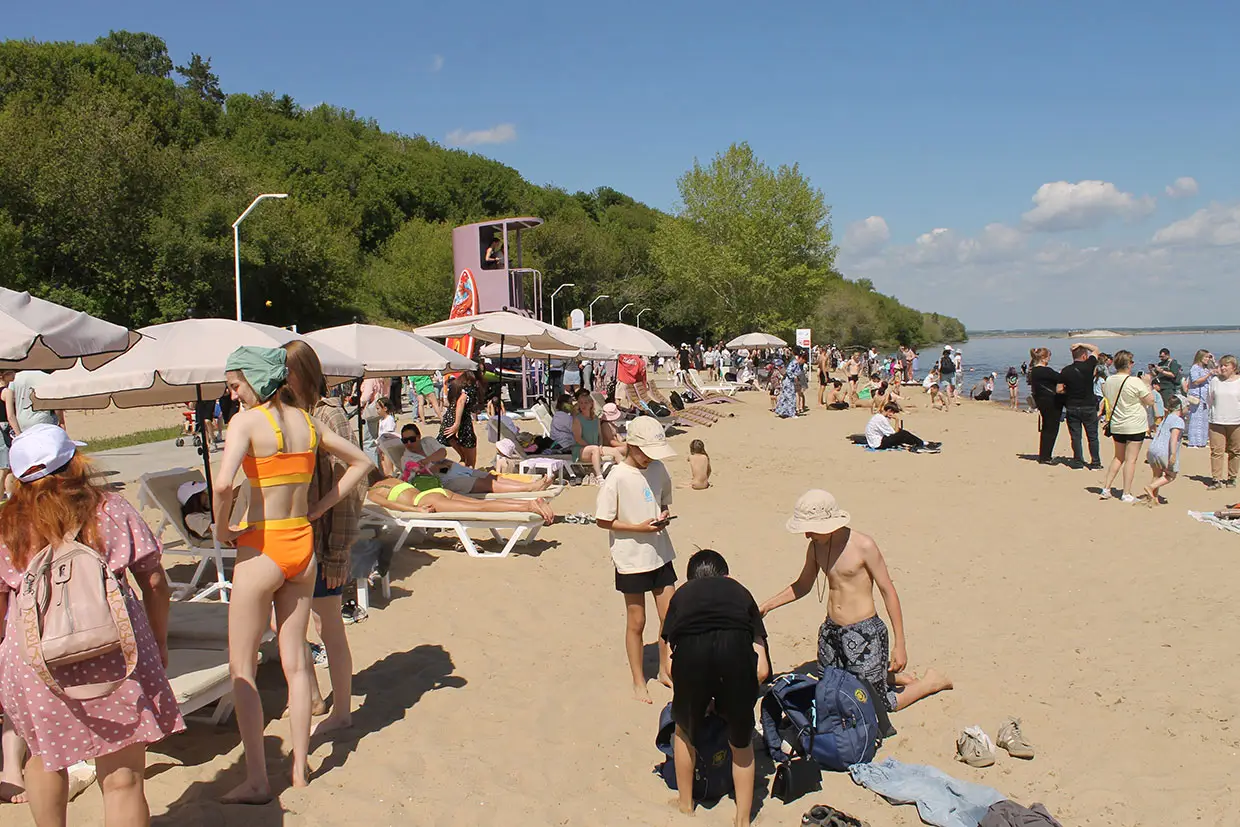На входе – информационный стенд с картой, с указанием основных мест пляжа. Присутствуют туалеты. пункт охраны, кабинки для переодевания. Полоса пляжа, непосредственно примыкающая к Каме – состоит из золотистого мелкого песочка, что порадует как ребятню, так и взрослых.
