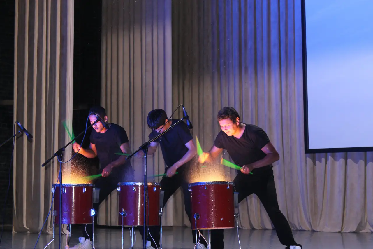 Нужно отметить, что сюрпризы и неожиданные подарки от организаторов праздника сыпались как из рога изобилия. Официальная часть мероприятия началась с совсем неофициального выступления барабанного шоу "SPLASH" из г. Уфы, которые зарядили весь зал энергией и позитивом.