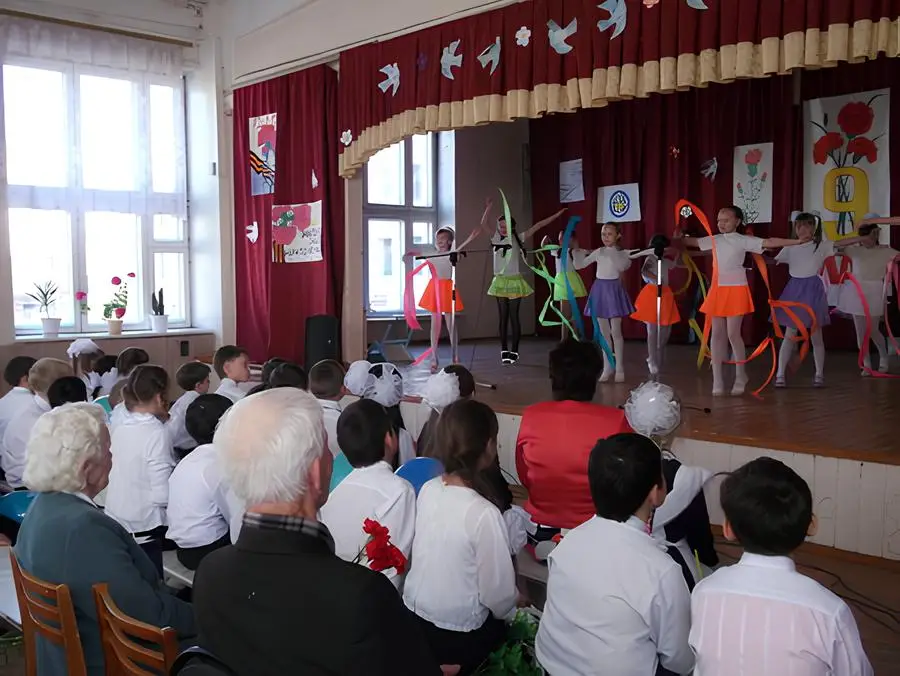 Зал был красиво украшен рисунками, плакатами, вырезанными из бумаги голубями и цветами. Учителя были ведущими, а главными артистами и, конечно, зрителями – сами дети, их родители, бабушки и дедушки, а также приглашённые на праздник ветераны Великой Отечественной войны – Февралёв А.Т. и Георгиевская Н. М.