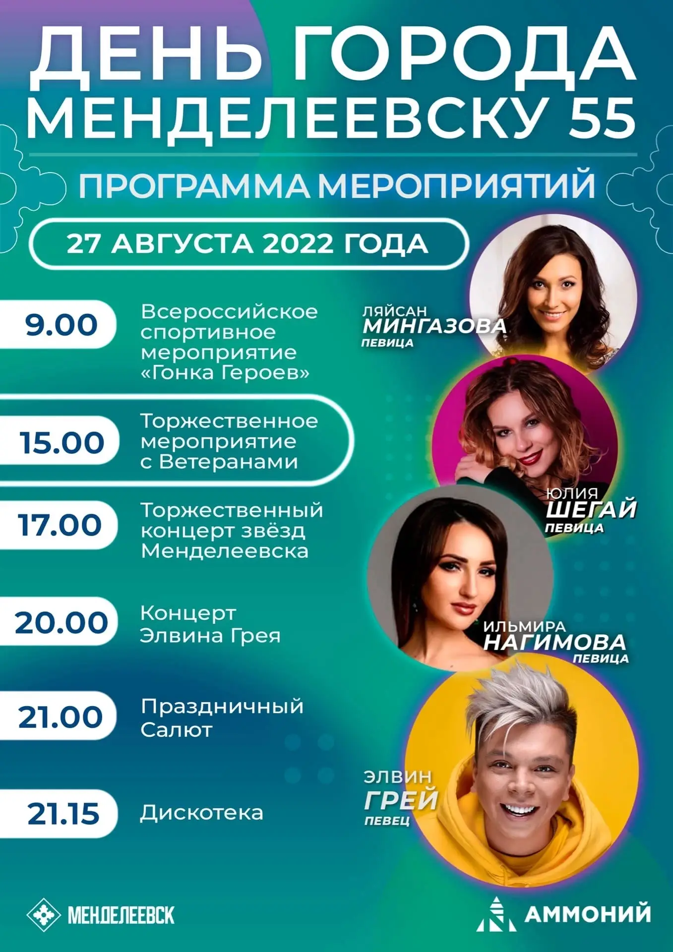 - с 18:00 стартует торжественный концерт звезд Менделеевска и Российской эстрады с участием Ляйсан Мингазовой, Юлии Шегай, Ильмиры Нагимовой, Элвина Грея.
