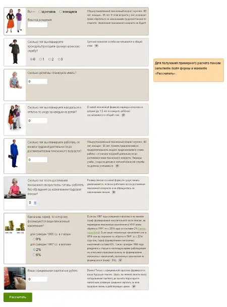 Для того чтобы рассчитать условный размер своей будущей пенсии, нужно заполнить поля формы из 8-ми вопросов и нажать «Рассчитать». К каждому вопросу приведены комментарии о влиянии того или иного параметра на размер будущей трудовой пенсии.