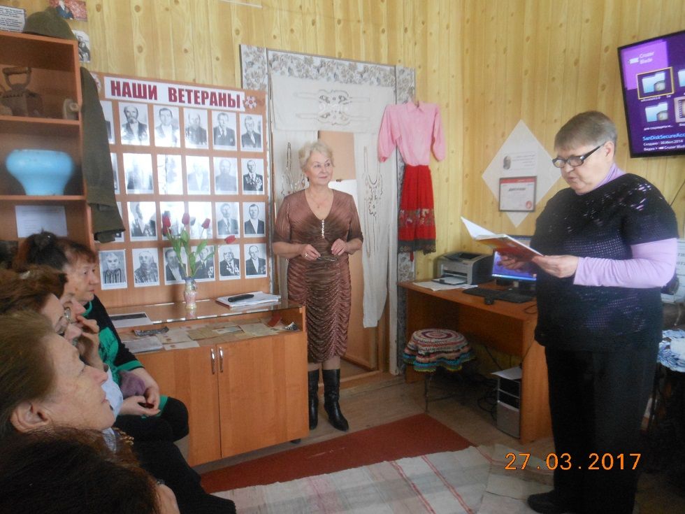 Состоялась встреча с местной поэтессой Раисой Коренек, посвятившей прекрасные строки малой родине. Председатель местного отделения Союза пенсионеров России, руководитель Школы правовых знаний, Розия Бикметова от имени присутствующих поблагодарила Надежду Степановну за теплый прием и вручила в дар библиотеке художественную литературу.