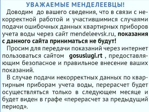 Данное известие стало для нас полной неожиданностью – нам сообщили об этом наши посетители, которые увидели сообщение в ленте Instagram городской газеты «Менделеевские Новости». В сообщении говорится, что прием показаний счетчиков воды через сайт Менделеевск.RU прекращается из-за некорректной работы и участившихся ошибок при передаче показаний.