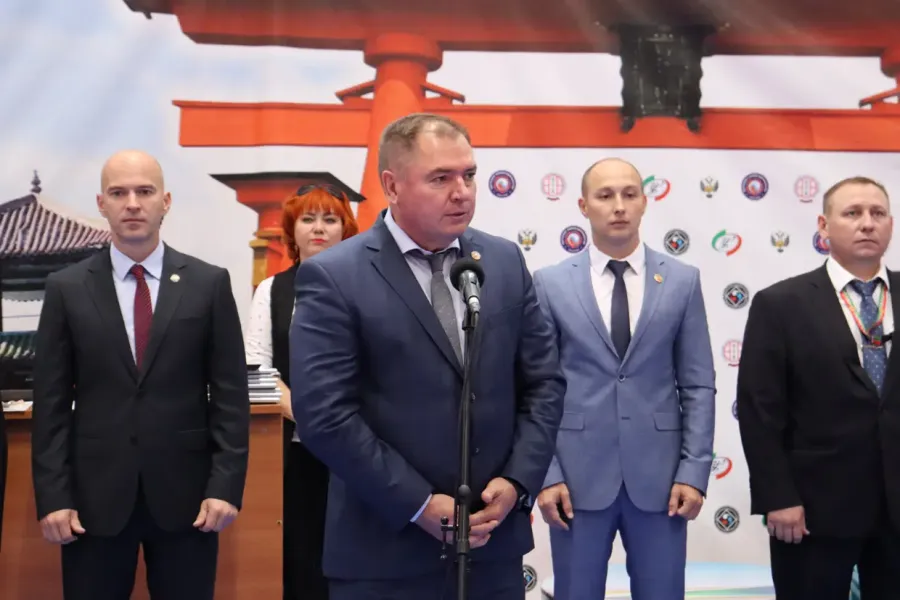 С приветственными словами и поздравлениями на открытии Чемпионата выступили такие уважаемые гости как: Глава Менделеевского муниципального района - Чершинцев Валерий Сергеевич, Председатель Государственного комитета Республики Татарстан по туризму - Иванов Сергей Евгеньевич, Вице-президент филиала Российского Союза Боевых Искусств по Республики Татарстан - Шарафиев Эдуард Сулейманович, Председатель президиума Союза общественных деятелей РТ, Руководитель Исполнительного комитета филиала Российского Союза Боевых Искусств по Республики Татарстан - Даренков Александр Александрович, Почетный президент Федерации каратэдо Сито-рю, Кобудо РТ Гафаров Рустам Исмагилович.